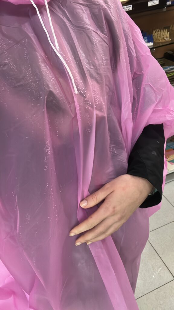 Nach einer Weile bin ich dann aus dem Café rausgegangen und der Regen hat meine Klamotten (schon wieder) komplett durchnässt, worüber ich dann aber einfach gelacht habe und mir einen dieser 3 Euro Plastik Regenmäntel zum überwerfen gekauft habe – sah natürlich total elegant an mir aus. Ich fand die Situation dann einfach lustig weil der Regenmantel (wenn man dass überhaupt so nennen kann) an mir aussah wie ein riesiger Müllsack und weil ich innerhalb von ein paar Minuten total nass war und meine Haare und mein Gesicht total getropft habe und ich die Situation einfach total absurd und irgendwie amüsant fand.