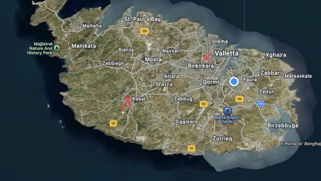 Das linke Kreuz is Mdina (ursprünglicher Treffpunkt) und das rechte Kreuz ist Msida