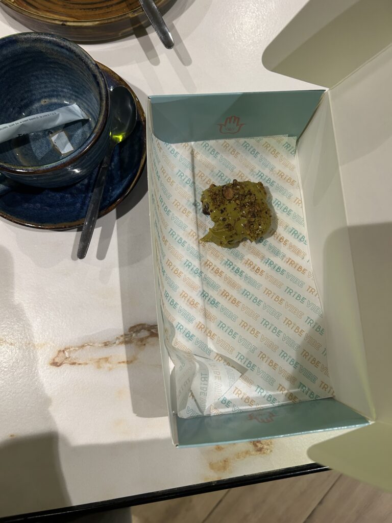 Das war die einzige Boxengröße, die das Café hatte… Und bei einem Brownie für 4€ ist dieses Viertel da einen ganzen Euro wert – das wird nicht zurückgelassen!