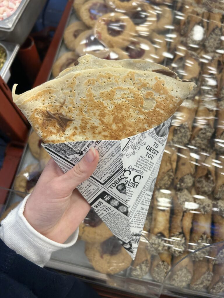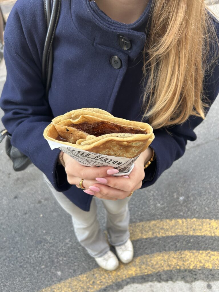 Mein Buch war auch überraschend spannend an der Stelle und als Lea dann angekommen ist, hab ich mir eine „thick hot chocolate“ gekauft.. Das mit dem „thick“ haben die sich wirklich sehr zu Herzen genommen.. Es hat mehr geschmeckt wie Pudding als wie ein heißes Getränk aber wir haben uns dass dann geteilt und den „Pudding“ mit diesen verboten dünnen Holzstäbchen gelöffelt (wenn man das überhaupt so nennen kann). Weil wir beide irgendwie noch Lust auf einen Crêpe hatten, sind wir dann ein paar Minuten zu einem Laden gelaufen der die verkauft hat und haben uns dann einen Schokolade-Erdbeeren Crêpe gekauft. Irgendwie kamen ALLE anderen Bestellungen vor unserer fertig über den Tresen und wir hatten irgendwann den Eindruck, dass der Koch zu dem Zeitpunkt einfach keinen Bock darauf hatte einen Crêpe zu machen..