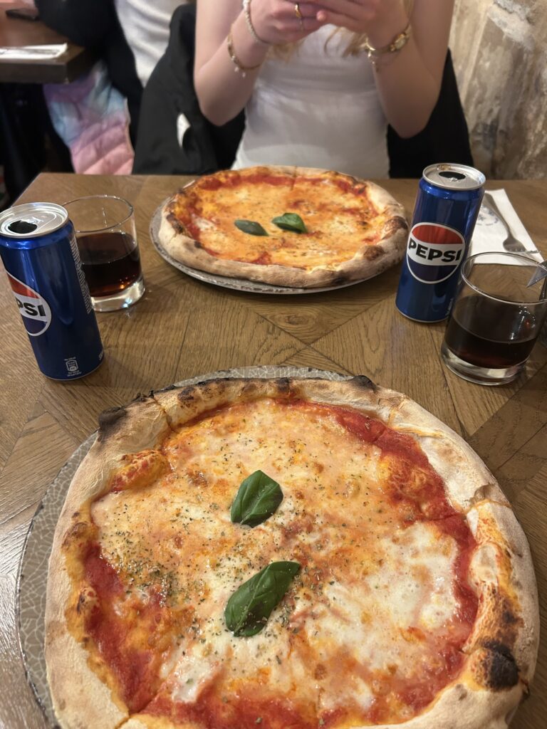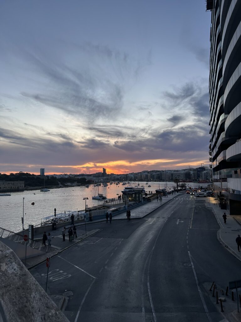 Nachdem wir am Hafen rumgelaufen sind, sind wir dann noch kurz durch ein paar kleine Gassen gelaufen und haben uns ein Restaurant zum Abendessen gesucht. Lisa und ich haben beide eine einfache Pizza Margherita genommen und Lea hat sich Bruscetta gekauft. Anfangs hat die Pizza auch noch echt gut geschmeckt, aber nach ein paar Stücken ist mir aufgefallen, dass da total viele Mehlklumpen am Boden der Pizza sind und man im Prinzip die ganze Zeit nur auf denen herrumkaut.. Den Rest der Pizza habe ich mir dann später einpacken lassen aber auch Leas Essen war nicht der Hammer. Es war so viel Knoblauch drauf, dass man es praktisch nicht mehr essen konnte. An sich war da Restaurant auch echt ganz hübsch aber hinter uns liefen die ganze Zeit ziemlich perverse Sachen im Fernsehen, die zum Glück nur Lisa ertragen musste, weil sie die einzige war, die mit dem Gesicht zum Fernseher saß 😂. Nach dem Essen sind wir dann alle mit dem Bus nach Hause gefahren und ich habe auf der Heimfahrt kurz mit einer Freundin telefoniert. Ich fand den Nachmittag total schön und mir hat die gesamte Atmosphäre in Birgu unfassbar sehr gefallen, weil mich die ruhige Gegend, die wenigen Leute und der schöne Sonnenuntergang innerlich sehr entspannt haben.