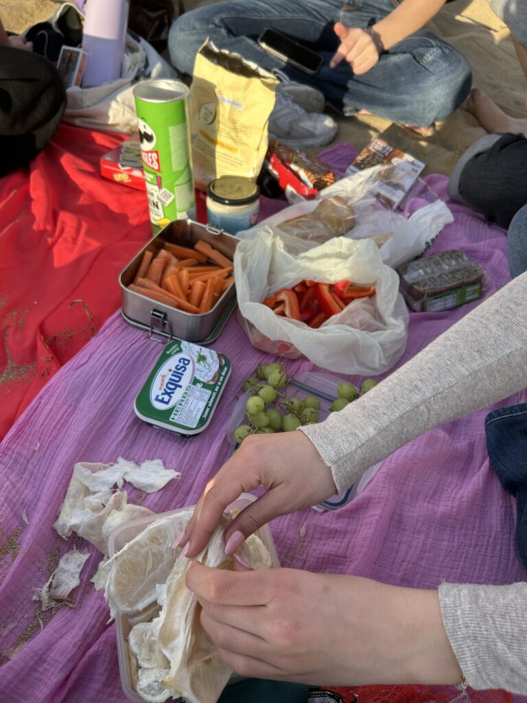 Am Freitag hatte ich vormittags wieder Schule. Im ICT Unterricht, spricht die Lehrerin normalerweise einigermaßen Englisch aber auch sie hat inzwischen angefangen mir einfach zu sagen: „Ja also das was ich jetzt sage ist für die Prüfung und da du die nicht mitschreibst rede ich die ganze Stunde jetzt auf maltesisch“ – toll.. Schule ging so mäßig schnell rum und danach bin ich zusammen mit einer Schulfreundin Ema nach Hause gelaufen, weil sie nur zwei Straßen von mir entfernt wohnt. Aus den eigentlichen 5 Minuten meines Weges wurden dann aber leider 25 Minuten, weil wir uns verquatscht haben. An sich war das ja was gutes, aber an dem Tag hat es mir nicht so wirklich gepasst, weil ich nur wenig Zeit hatte und noch ein paar Sachen für das Treffen mit den Anderen einkaufen musste. Wir haben das Treffen dann auch noch um eine halbe Stunde nach hinten verschoben und ich bin durch ganz Paola gerannt um Früchte zu finden. In den gewöhnlichen Convenience Stores gibt es nur Äpfel uns sonst nichts. Ich bin (wortwörtlich) gerannt um irgendwo eine Melone und Trauben zu finden und habe dann letztendlich in einem Supermarkt  12 Minuten von meinem Haus entfernt eine Pomelo und Trauben gefunden. Ich war eh schon viel zu spät dran und dann hat die Frau an der Kasse wirklich eine Ewigkeit dafür gebraucht abzukassieren. Als ich es dann endlich in meinen Bus geschafft habe war ich Hangry weil ich an dem Tag fast noch nicht gegessen hatte und ich war auch echt müde. Die Fahrt (in zwei Bussen) hat etwa 1 1/2 Stunde gedauert und ich habe zwar versucht mich auszuruhen, habe dann aber irgendwann aufgegeben weil es in einem vollen Bus echt schwer ist alleine einen Power Nap zu machen. Zwischendrin war mir echt langweilig aber die Aussicht auf ein Picknick am Strand hat geholfen. Als ich endlich da war, haben die anderen gerade Volleyball gespielt und wir haben uns dann auf unsere Handtücher gesetzt und jeder hat sein Essen ausgepackt. Ich hatte Früchte dabei, Lea hatte Brot dabei (dieses Brot war soo lecker), Lina hatte Dips dabei, Lina Gemüse und Patricia hatte Snacks. Es war (vor allem nach einem langen Tag nichts richtiges Essen) wirklich echt lecker.