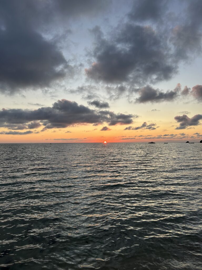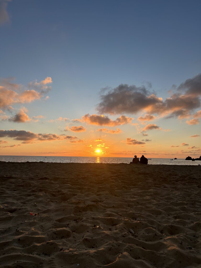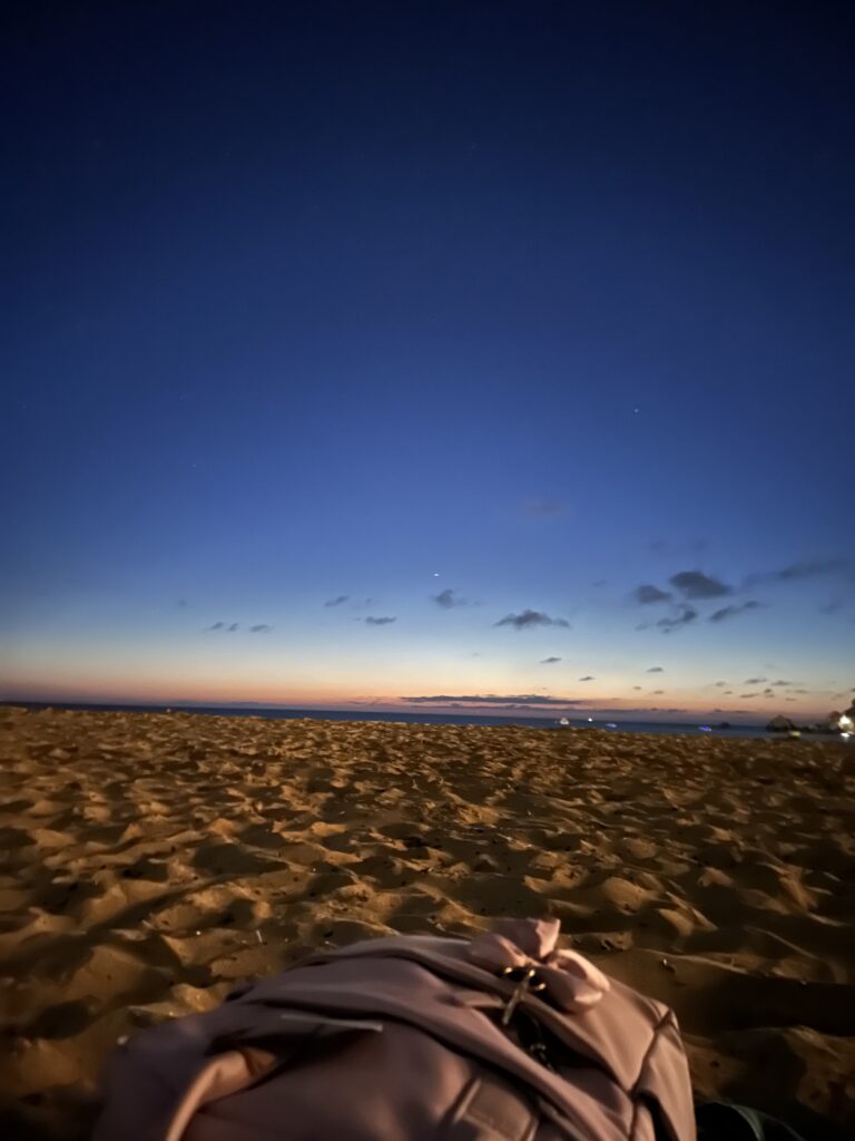 Wir haben dann eine Runde Uno gespielt, bei der wir aber irgendwie fast alle zu abgelenkt waren weil wir derweil was spannendes beredet haben. Danach haben wir noch ein wenig Volleyball gespielt und meine Handgelenke haben dezent weh getan.. Während dem Volleyball spielen sind Lisa und Lina aus Versehen ineinander gerannt und Lisa hat sich ihren Fuß dabei aufgeschürft, weshalb wir das dann noch ein wenig verarztet haben. Wir haben Fotos gemacht und uns den Sonnenuntergang angeschaut. Nicht nur den Moment wenn der Orangene Punkt der Sonne nicht mehr am Horizont zu sehen ist, sondern den kompletten Sonnenuntergang bis es Stockdunkel war (woher kommt eigentlich die Bezeichnung „Stockdunkel“ – gibt es die überhaupt, oder habe ich mir die ausgedacht?). Wir lagen dann alle da auf unseren Handtüchern, haben eine Fake Lava Lampe mit einer Handy-Taschenlampe und einem unausgetrunkenen Eistee gebaut und Lina hat auf ihrer Ukulele Songs gespielt und dazu gesungen. Es war so ein richtiger Strand Vibe irgendwie.