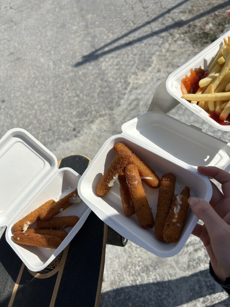 Nach 10 Minuten ist Lina dann auch schon gekommen und sie hatte ihr Skateboard dabei. Wir sind dann schonmal ein bisschen rumgelaufen und sie hat mir erzählt, dass sie einfach auch bei diesem seltsamen Parkplatz angekommen ist und da nicht durch konnte (das sollte bei Google Maps echt mal geändert werden). Wir haben dann gegenseitig Fotos voneinander mit meiner Kamera gemacht und sind dann als Lea angekommen ist zusammen zu einem Food Truck gelaufen, um uns ein bisschen was zu essen zu kaufen. Als wir dort waren ist uns aufgefallen wie teuer das Ganze ist und deswegen haben wir alle jeweils nur ein bisschen was genommen und sind dann damit zurück in den Park gelaufen. Weil wir auf dem Weg schon hungrig waren haben wir schon auf dem Weg zurück in den eigentlichen Park gegessen und wir haben uns dann eine Bank gesucht und haben uns dort hingesetzt.