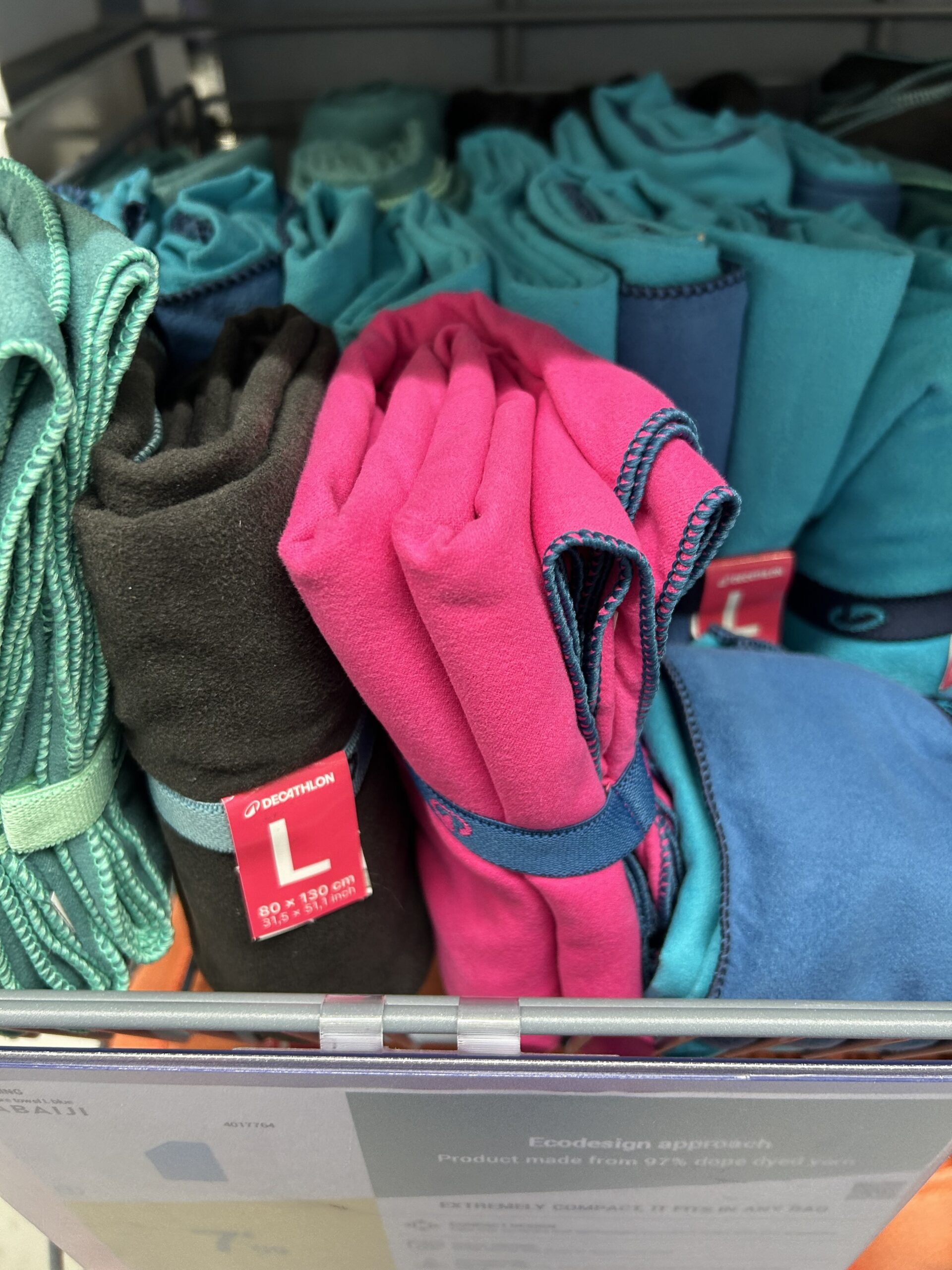 Nach dem Essen haben wir den Decathlon erst nicht gefunden und dann als wir endlich vor der richtig geschnittenen Hose standen, gab es Leas Größe nicht mehr. Sie hat dann trotzdem eine Größe größer anprobiert aber nachdem die nicht perfekt gepasst hat, wollte sie die Hose dann eigentlich in der richtigen Größe beim Laden bestellen. Der Mitarbeiter meinte dann zu uns, dass wir im Laden schauen sollen, ob wir sie nicht doch aus Zufall finden, weil es dort wohl im Moment so „unorganisiert“ sei und noch die Wahrscheinlichkeit besteht, dass die Hose irgendwo in Frieden hängt und nur auf Lea wartet (meine Worte, nicht seine – keine Sorge). Ich bin dann einen Gang weiter und hab neben ein paar Stapeln unsortierter Kleidung die passende Hose gefunden und das sogar in mehreren Größen. Ich hab mich richtig schlau gefühlt, weil ich die so schnell gefunden habe. Lea hat die dann anprobiert und war sich immer noch unsicher, welche sie nehmen wollte, weil die die perfekt gepasst hat einfach ein Loch hatte… Während sie die Hosen weiter anprobiert hat bin ich durch den Laden geschlendert und habe diese typisch deutschen Decathlon Handtücher gefunden, die man immer im Freibad oder am Strand dabei hat, die aber (wenn man nass ist) gefühlt kein Wasser aufsaugen. Davon hab ich mir dann noch eines gekauft, weil ich hier nur eines mit dabei habe und schon davor gemerkt habe, dass es schlauer ist mindestens zwei Handtücher dabei zu haben, wenn man am Strand ist.